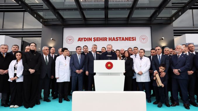 Cumhurbaşkanı Erdoğan, Aydın Şehir Hastanesinin aynı zamanda bir eğitim ve araştırma hastanesi de olacağını dile getirerek, şunları kaydetti: “Hem nitelikli kadrosuyla Aydın halkına sağlık hizmeti sunacak hem de ülkemize tıp alanında kadro yetiştirecek. Benim Aydınlı kardeşim birinci sınıf sağlık hizmetini başka yere gitmeden kendi şehrinde alacak. Aralarında 75 yataklı Çine Devlet Hastanemizin, Didim Devlet Hastanemizin 75 yataklı ek binasının, Nazilli’de 40 üniteli Ağız ve Diş Sağlığı Merkezinin de olduğu diğer sağlık yatırımlarımızın da şehrimize hayırlı uğurlu olmasını temenni ediyorum. Hizmete sunduğumuz eğitim kurumları, hükûmet konakları, spor tesisleri, köprüler, 276 kilometre uzunluğunda sinyalizasyon projesi, yangın havuzu ve göletlerin de Aydın’a hayırlı olmasını diliyorum.”